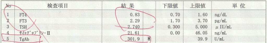 甲状腺ホルモンと甲状腺刺激ホルモンは基準値内、甲状腺の自己抗体はどちらも基準値を大きく上回っていました。